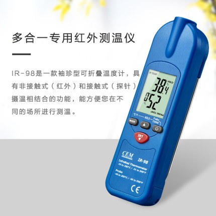 CEM IR-98/99可折疊多合一紅外線測溫儀集非接觸式紅外線測溫、針式測溫、鉗夾測溫于一體,為您在苛刻環(huán)境下的測溫提供最佳解決辦法和測溫工具。