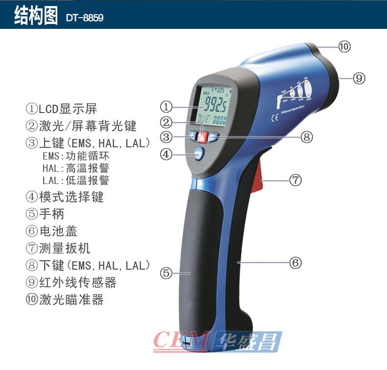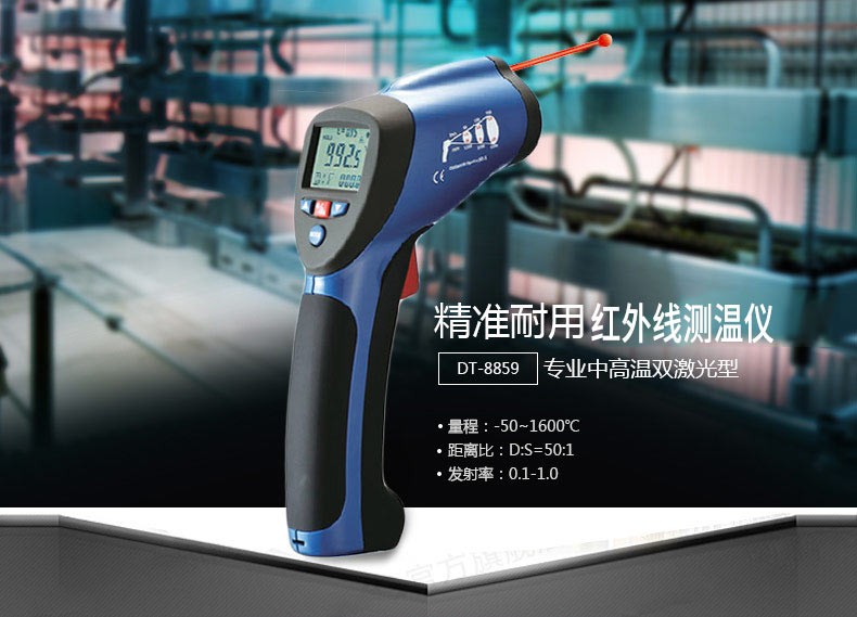 DT-8829紅外線測溫儀一種專業(yè)型的手持式非接觸紅外線測溫儀,使用簡易,設計堅實,測量準確度高,測溫量程范圍寬等特點。它具有激光瞄準,帶背光源顯示器,最大值,最小值,平均值,差值,數(shù)據(jù)保持,高低溫報警,發(fā)射率可調及自動關機功能。該手持式非接觸紅外線測溫儀可用于測量那些不適合使用傳統(tǒng)接觸式測量方法來測量物體的表面溫度(例如移動物體,帶電表面和難以接觸到的物體)。特征:非接觸式精確測溫高的光學測量距離與物體目標比(D:S-16;1/50:1)測溫量程范圍寬獨特新式的機殼設計內置激光瞄準器自動數(shù)值保持℃/F轉換按鍵發(fā)射率調整從0.10 到1.0,(8829固定在0.95)MAX,MIN,DIF,AVG 溫度顯示帶背光源LCD顯示屏自動選擇量程,分辨率為0.1