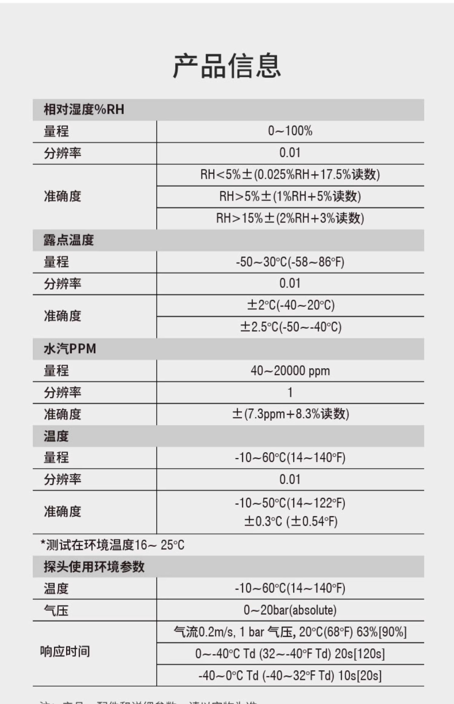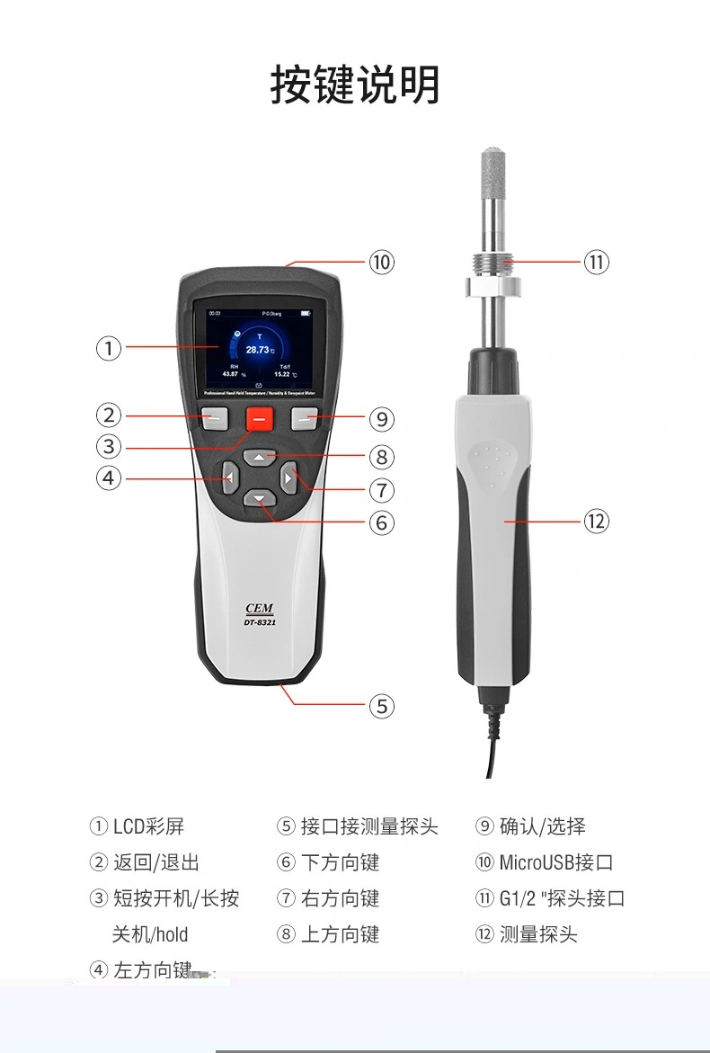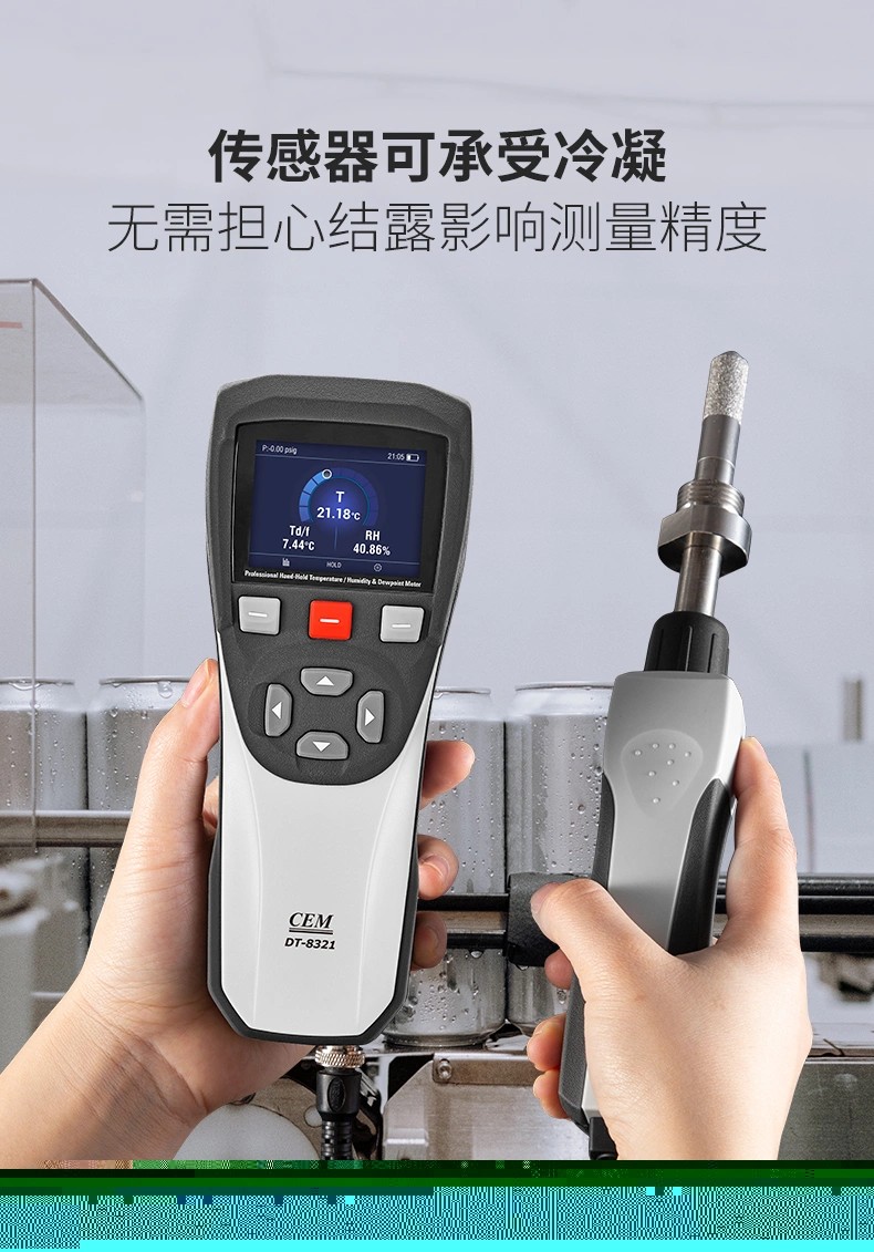 產(chǎn)品概述 CEM DT-8321是CEM華盛昌新設計、研發(fā)和制造的一款高精度專業(yè)手持式露點儀,精度高范圍廣,能在較寬的測量范圍內(nèi)準確測量露點溫度,探頭可直接插入加壓過程中,并快速響應測試過程環(huán)境條件,為工業(yè)露點測量應用提供準確快速的測量。產(chǎn)品廣泛應用于實驗室、電力電氣、SF6氣體測量、精密制造、化工制藥等領域的大溫度、大壓力范圍內(nèi)的直接過程露點測量。 產(chǎn)品優(yōu)勢 性能穩(wěn)定,維修成本低,可專業(yè)用于工業(yè)現(xiàn)場檢測和戶外校驗等場合。 高品質(zhì)傳感器,測量更準確,適用于低露點測量。測量范圍達-50至+30°C,低濕度測量<5%RH。●傳感器可承受凝結,無需擔心結露影響測量精度。 傳感器探頭具備凈化功能以及加熱功能,預熱時間短,測量結果更穩(wěn)定。 靈活的數(shù)據(jù)記錄功能,可設置自動記錄間隔,CSV文件可以通過USB傳輸?shù)絇C端。 測量數(shù)據(jù)可一鍵保存,可使用電腦中的Excel軟件查看。 外形堅固,緊湊,小巧,外加藍色彩屏設計,界面更加直觀簡潔。 可充電設計,持久續(xù)航更方便。