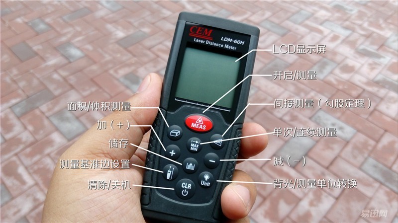 LDM-60H激光測距儀的功能按鍵為10鍵分布,紅色按鍵為開關(guān)鍵和測量按鍵。其他9鍵分別對應(yīng)日常測量工作所需的各種功能。激光測距儀可使用的范圍還是比較廣的,比如距離測量、房屋驗收、室內(nèi)裝修、家具安裝、工程測量、機(jī)械工程、交通消防、規(guī)劃行業(yè)、裝潢行業(yè)、倉庫物流、建筑施工等,所以,這9鍵對應(yīng)的功能還是很實用的。后邊,筆者將就自己用到的一些功能分享出來。