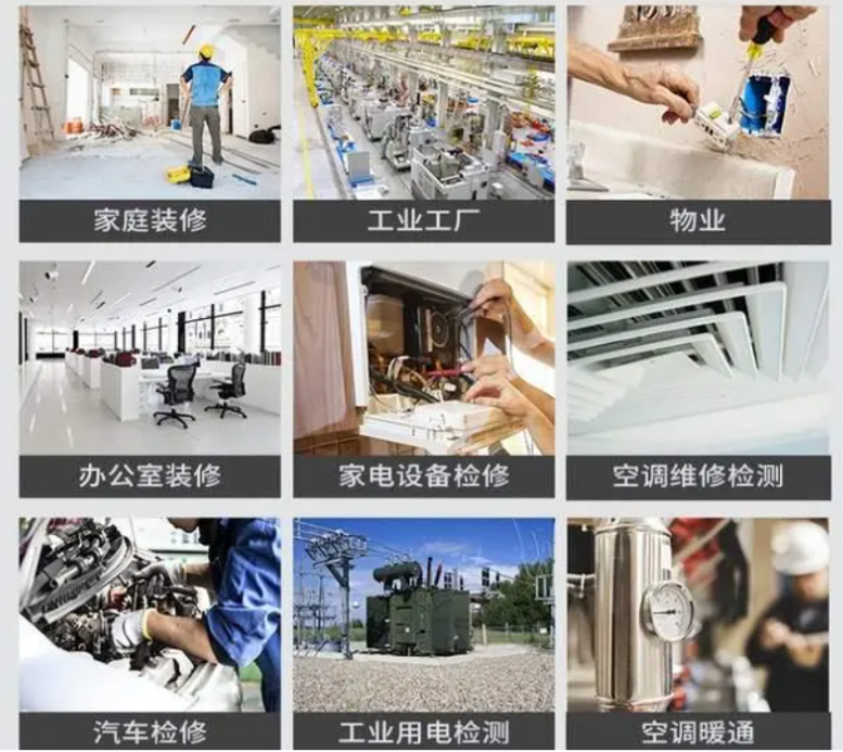 用于家庭或辦公室裝修、物業(yè)維修、家電設(shè)備檢修、汽車檢修、工業(yè)用電檢測等場景。
